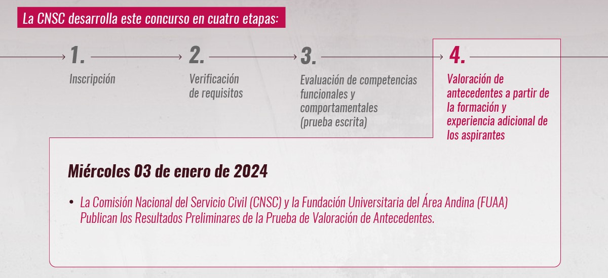 Continuando con el Proceso de Selección de las Entidades del Orden Nacional 2022, el miércoles 3 de enero de 2024, la Comisión Nacional del Servicio Civil (CNSC) y la Fundación Universitaria del Área Andina (FUAA) notificaron a los aspirantes sobre las actividades vinculadas a la Prueba de Valoración de Antecedentes a través de su sitio web.